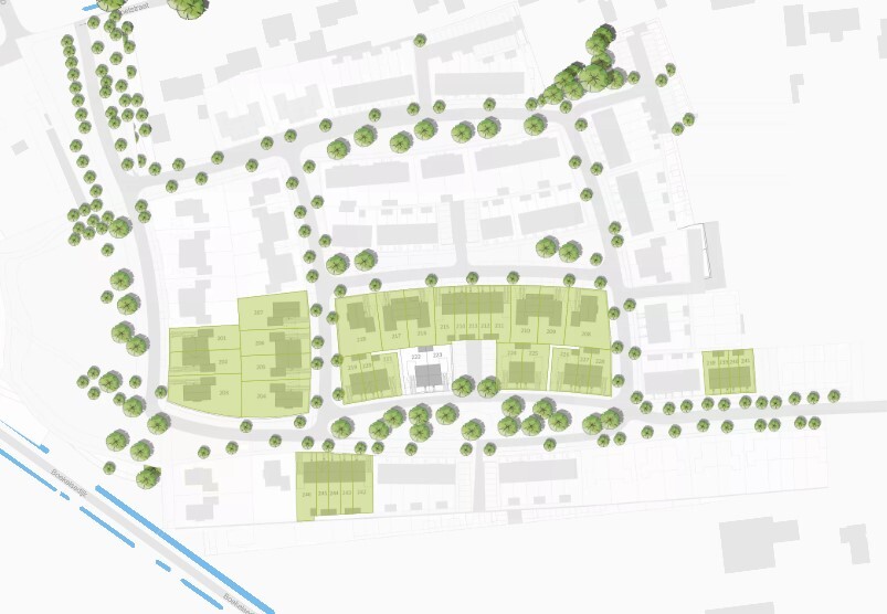 Op onderstaande afbeelding staan de 117 koopwoningen, 63 huurwoningen en 6 bouwkavels aangegeven: